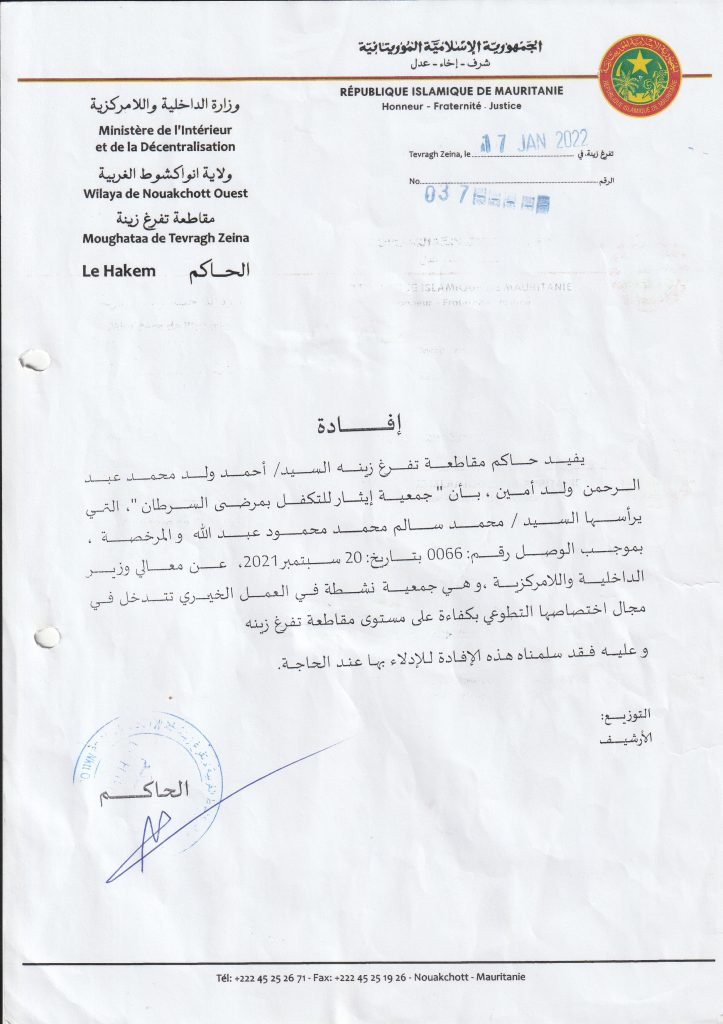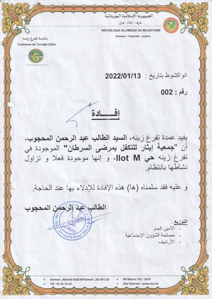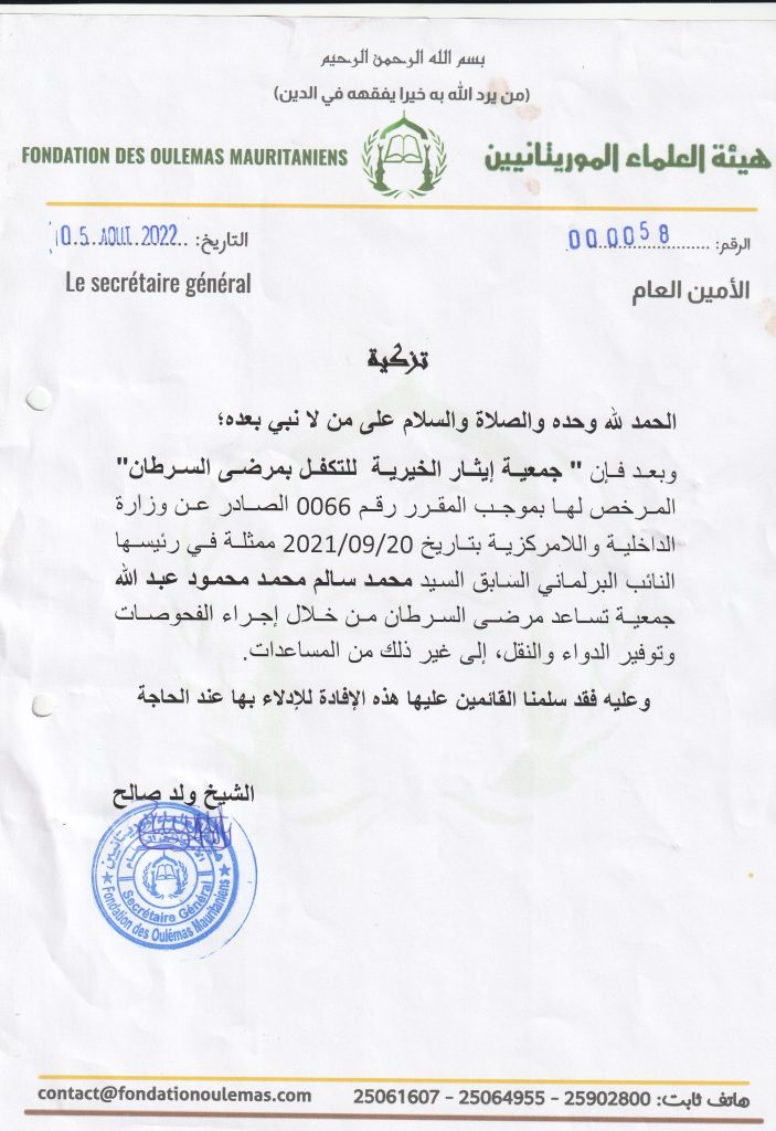 بالصور: شخصيات علمية وصحية وإدارية تمنح تزكيات للجمعيةمحمد سالم الشيخ معلوميناير 5, 2026الكل منحت بعض الشخصيات العلمية والصحية والإدارية تزكيات لجمعية إيثار الخيرية للتكفل بمرضى السرطان، عرفانا منھا لھا بجميل ماقدمتھ وتقدمھ لمحاربي مرضى السرطان وھذھ صور التزكيات