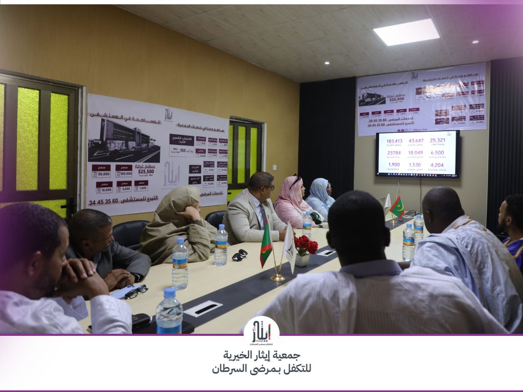 وقد استقبل الوفد من طرف رئيس الجمعية السيد يسلم عبد اللھ، حيث استعرض لھم الخدمات التي تقدمھا الجمعية لمحاربي السرطان في المركز الوطني للأنكولوجيا، من خلال مكتب الجمعية في المركز