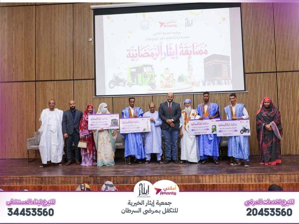 نظّمت جمعية إيثار الخيرية للتكفّل بمرضى السرطان، مساء اليوم الأحد، بفندق “فصك”، حفلاً لتوزيع جوائز المسابقة الثقافية الرمضانية، وذلك برعاية بنك الأمانة ممثَّلاً في تطبيقه “أمانتي”.وفي كلمته بالمناسبة، عبّر رئيس الجمعية، السيد محمد يسلم عبد الله، عن بالغ شكره لبنك الأمانة على رعايته ودعمه للمسابقة، مؤكداً أن هذه الرعاية كانت نموذجية ومتكاملة من مختلف الجوانب.واستعرض رئيس الجمعية أبرز الخدمات التي تقدمها “إيثار” لمرضى السرطان، إلى جانب مشاريعها الكبرى، وفي مقدمتها المصحة الخيرية التي تم تدشينها مؤخراً من طرف الجهات الرسمية، مشيراً إلى أنها توفّر خدماتها مجاناً لمرضى السرطان، كما تفتح أبوابها أمام عموم المرضى.ودعا رئيس الجمعية مختلف الفاعلين إلى الانخراط في جهود الجمعية، من خلال الدعم والمساهمة والانتساب، تعزيزاً لمسارها الإنساني والخيري.من جهته، عبّر المدير التجاري لبنك الأمانة، السيد خالد ابنو عبدم، عن اعتزاز البنك بدعم أنشطة جمعية إيثار ورعاية مسابقتها الثقافية، معتبراً أن هذا التعاون يشكّل تشريفاً للمؤسسة.بدورهم، عبّر المشاركون والفائزون في المسابقة عن شكرهم وامتنانهم للجمعية، مشيدين بأجواء التنافس الشفافة التي طبعت فعاليات المسابقة، وهو ما عكسوه من خلال نصوص أدبية عبّرت عن تقديرهم للمبادرة.وتضمنت الجوائز المقدّمة للفائزين: حجة إلى بيت الله الحرام للفائز الأول، وعمرة للفائز الثاني، فيما نال الفائز الثالث سيارة ثلاثية العجلات (توك توك)، وحصل الفائز الرابع على دراجة نارية.#إيثار#نحن_انكدو#إنجازات_شاهدة